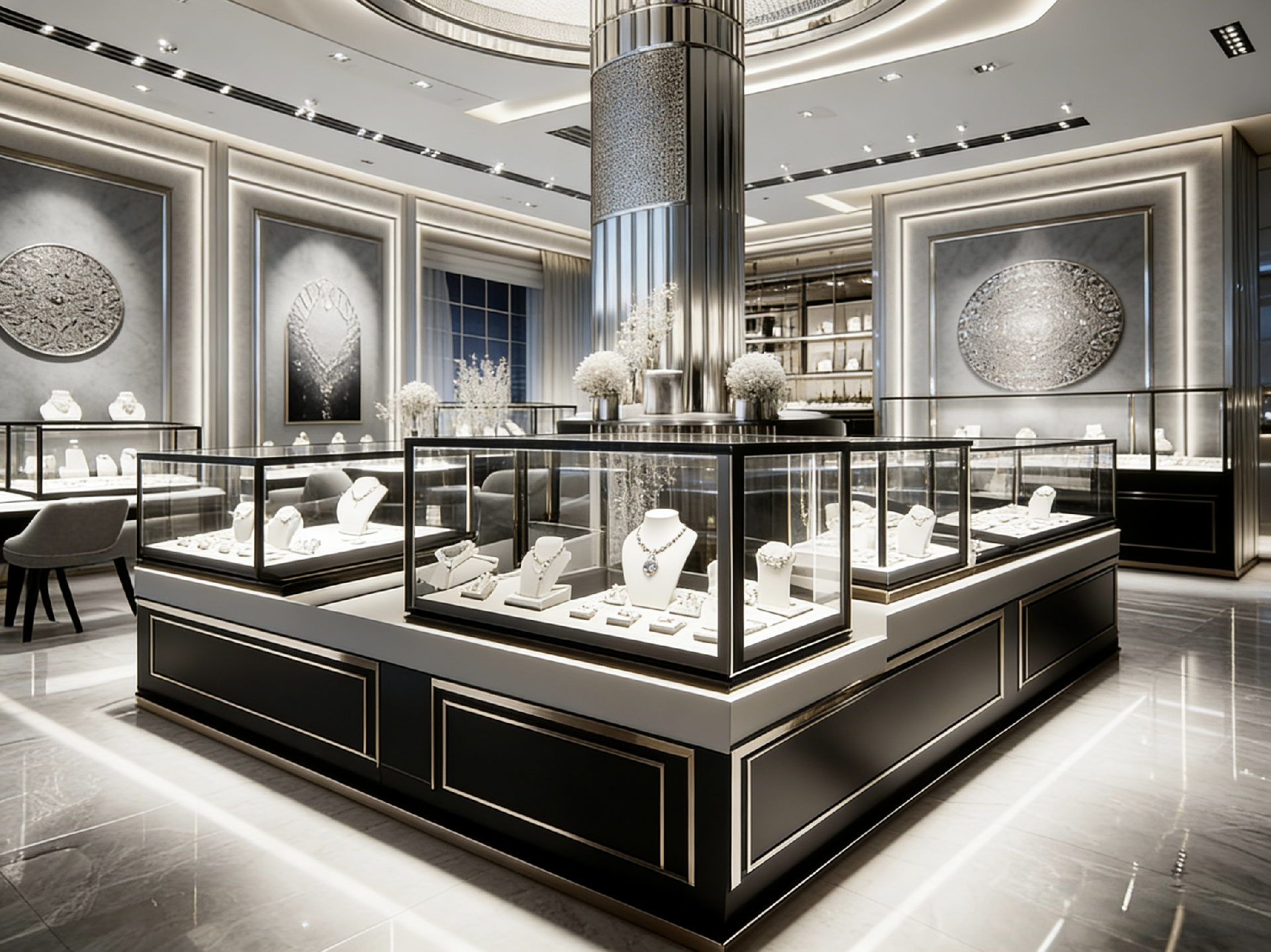 If you want to design a modern luxury jewelry store with silver and black tones, we offer key design insights for a sleek, upscale space: