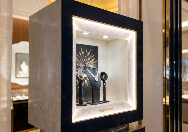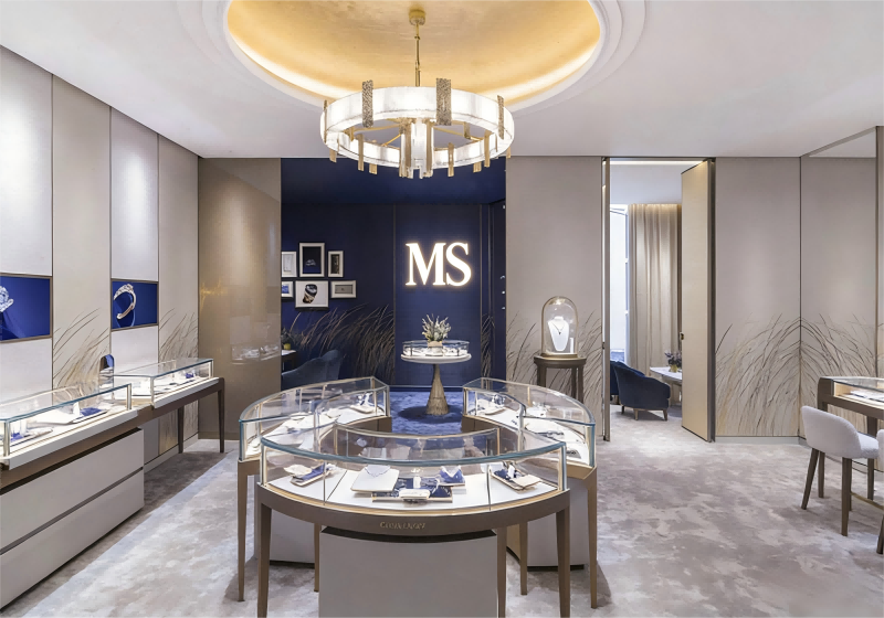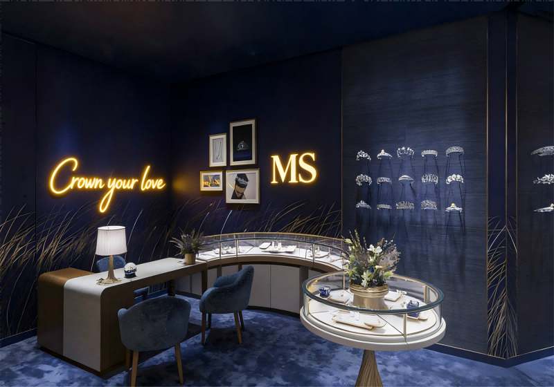 Our design and manufacturing team at MS DISPLAY LTD delivers a complete solution—from curved glass showcases, wall displays, halo-light signage, to custom seating—tailored perfectly to your brand identity and store layout. Ideal for high-value jewelry, bridal stores, engagement boutiques, and premium retail spaces.