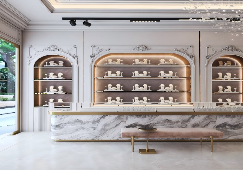Transform your store into a high-end jewelry boutique with our European-inspired arched wall display system. Every detail—from the carved moldings to the soft backlit shelves—is crafted to highlight your jewelry in the most luxurious way.