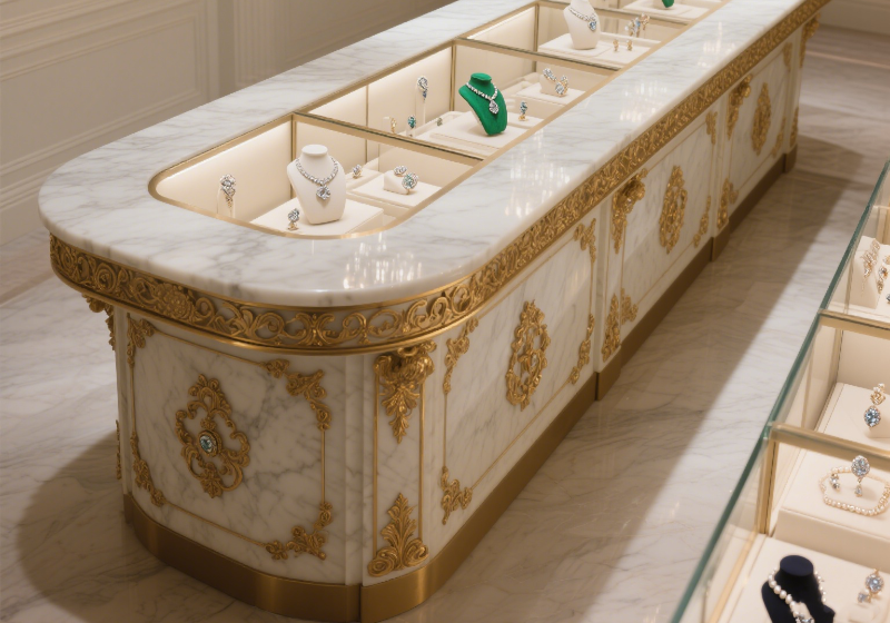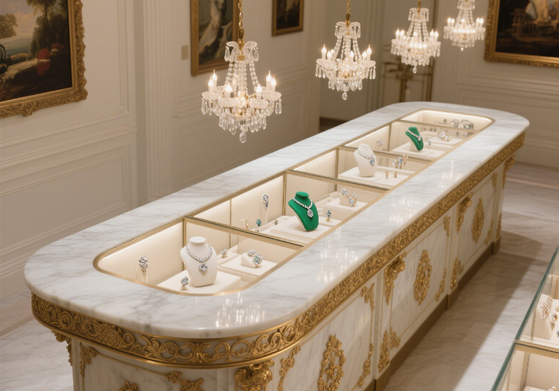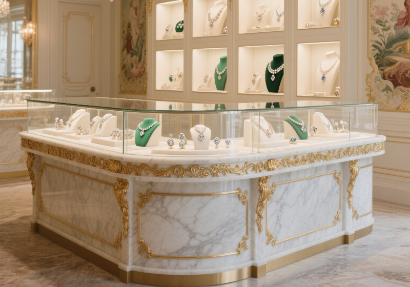 At MyShine, we believe luxury retail should feel like a royal experience. Our Royal Baroque Luxury Jewelry Display Cases, inspired by the opulent aesthetic of your reference fixture, blend statuary white marble, hand-carved 24k gold leaf accents, and ultra-clear glass to create a retail solution that is both grand and intimate. Designed for heritage jewelry houses, flagship boutiques, and luxury department stores, these displays elevate your collections to works of art, protect your high-value inventory, and optimize your website for Google search visibility—driving organic traffic and conversions for your business.
