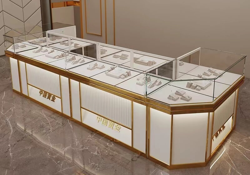 The tempered glass showcases allow customers to view jewelry clearly from multiple angles. This open yet secure structure encourages engagement while maintaining a premium retail atmosphere.
