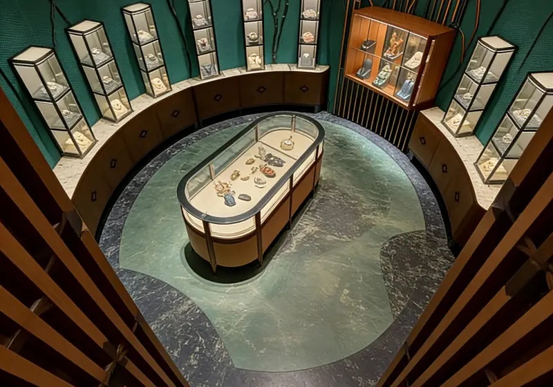This elegant semi-circular jewelry display counter features a curved all-glass enclosure for 360° viewing, a premium walnut-finished wooden frame and base with sleek tapered legs, a soft cream velvet interior lining to highlight jewelry, and integrated warm LED spotlights, perfectly suited for high-end retail environments to showcase luxury pieces in a sophisticated, luxurious setting.