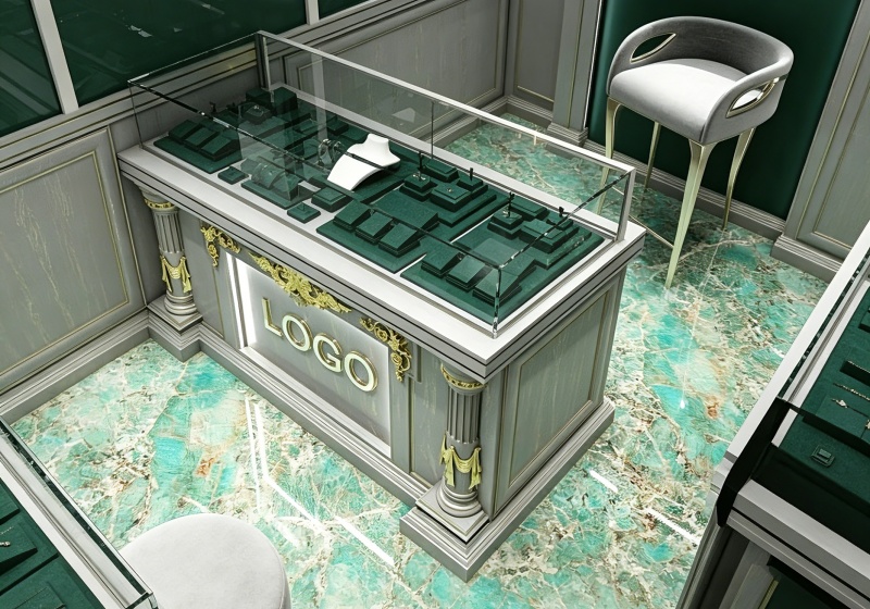 This luxury jewelry display cabinet reimagines timeless European opulence for high-end boutiques, featuring an elegant silver-toned frame adorned with intricate gold-leaf carvings and classical column accents that exude regal sophistication. The crystal-clear tempered glass top offers unobstructed visibility while protecting pieces, paired with rich emerald-green velvet trays designed to showcase rings, necklaces, and bracelets with striking contrast. An illuminated custom logo panel adds a bespoke brand touch, blending exquisite craftsmanship, premium materials, and functional design to elevate the presentation of fine jewelry.
