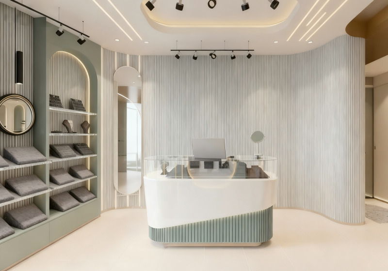 Combining curved streamlined showcases, ribbed texture walls and arch details to create a soft, layered space for daily light luxury jewelry and gentle designer pieces:Build a warm premium brand image with sage green ribbed panels, cream matte finishes and subtle silver accents.The layout features curved central counters + wall-mounted arch displays + open browsing zones, balancing jewelry visibility and relaxed exploration....