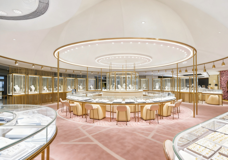 Combining circular luminous showcases, dome ceiling details and petal art walls to create an opulent, ceremonial space for wedding and couture jewelry:Build a regal romantic brand image with warm gold ribbed panels, blush pink accents and cream finishes.The layout features a central circular showcase + petal art feature walls + plush seating zones, balancing jewelry visibility and luxurious browsing experience....
