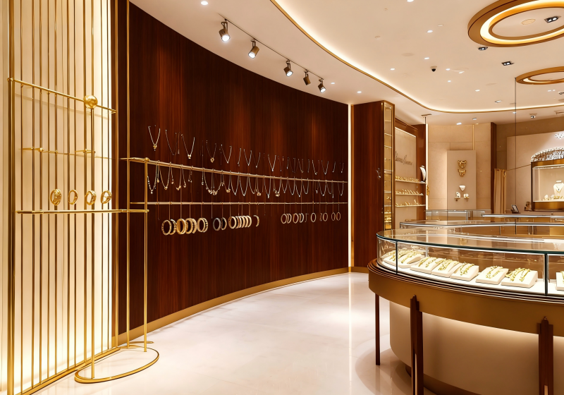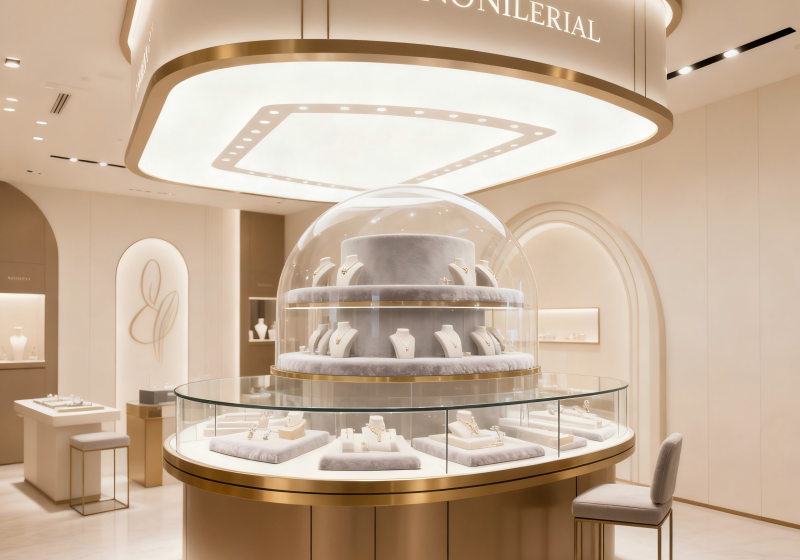 Combining floating luminous ceilings, arched doorways and circular showcases to create a soft, refined space for daily light luxury jewelry and designer pieces:Build a contemporary premium brand image with warm gold finishes, cream matte panels and subtle curved details.The layout features a central circular showcase + wall-mounted display shelves + intimate seating zones, balancing visibility and relaxed exploration....