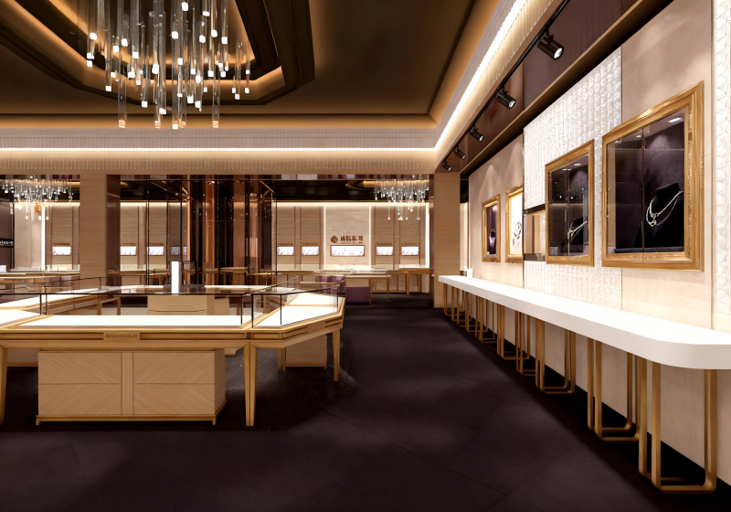 Combining crystal chandeliers, symmetrical showcases and art paintings to create an intimate, prestigious space for high-end couture and heritage jewelry:Build a regal contemporary brand image with dark espresso matte ceilings, light gold trim and warm wood finishes.The layout features symmetrical linear counters + wall-mounted art displays + private browsing zones, balancing jewelry visibility and exclusive appreciation....
