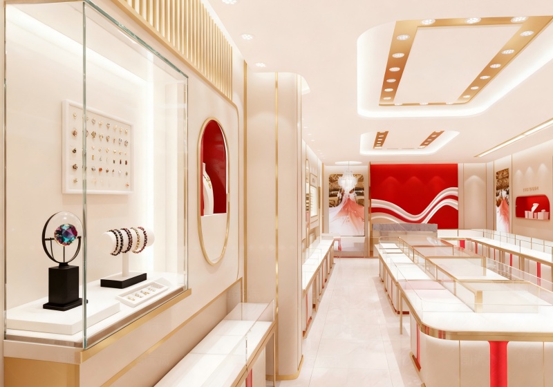 Combining curved luminous showcases, geometric ceiling details and artistic feature walls to create an opulent, ceremonial space for wedding and festive luxury jewelry:Build a regal celebratory brand image with scarlet red accents, cream finishes and light gold trim details.The layout features symmetrical linear counters + curved wall displays + festive accent zones, balancing jewelry visibility and a luxurious browsing experience....