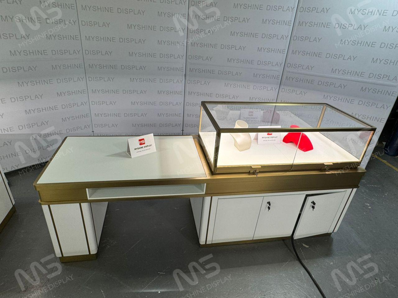 Our client wanted to upgrade their store with a new series of jewelry display showcases that combine a high-end look with clean, modern functionality. After understanding their needs, we customized this series of showcases featuring a white cabinet body with gold metal framing and a clear glass display top — perfectly balancing luxury aesthetics with practical retail use.