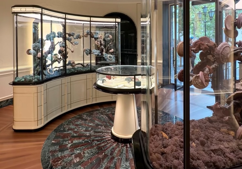 The space blends opulent materials with organic, nature-themed details. The ceiling features a hand-painted mural of flora, fauna, and aquatic life, while display cases are adorned with sculptural tree-branch and moss-like installations,