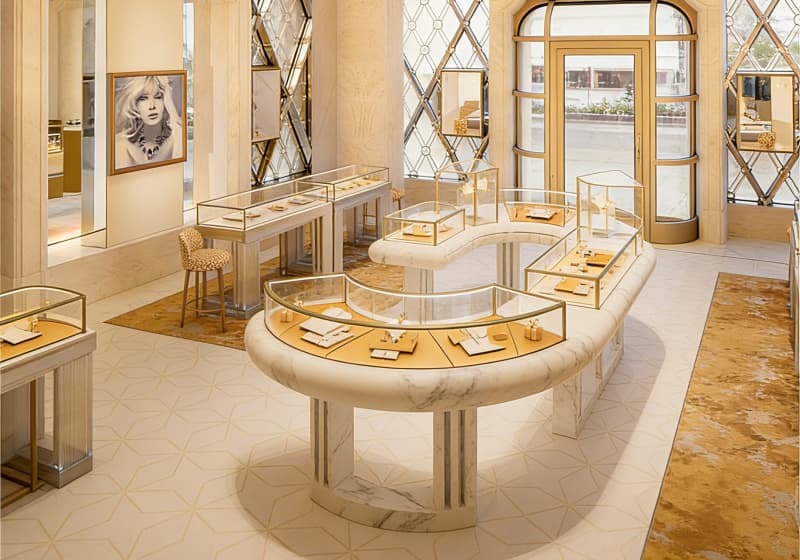 This is an exquisite luxury jewelry store that embodies timeless elegance and refined opulence. The interior is defined by graceful, curved white marble display counters, each framed with delicate gold trim and topped with clear glass cases that showcase fine jewelry, watches, and precious accessories. The floor features a sophisticated geometric pattern in soft ivory tones, accented by plush gold-hued rugs that add warmth and visual depth. Tall, smooth marble columns rise toward the ceiling, while large windows flood the space with natural light, creating an airy, inviting atmosphere. Woven high stools sit beside select counters, offering comfortable spots for personalized consultations. Every detail—from the warm metallic accents to the clean, minimalist lines—works together to craft a premium, serene shopping experience that highlights the beauty and craftsmanship of the jewelry within.