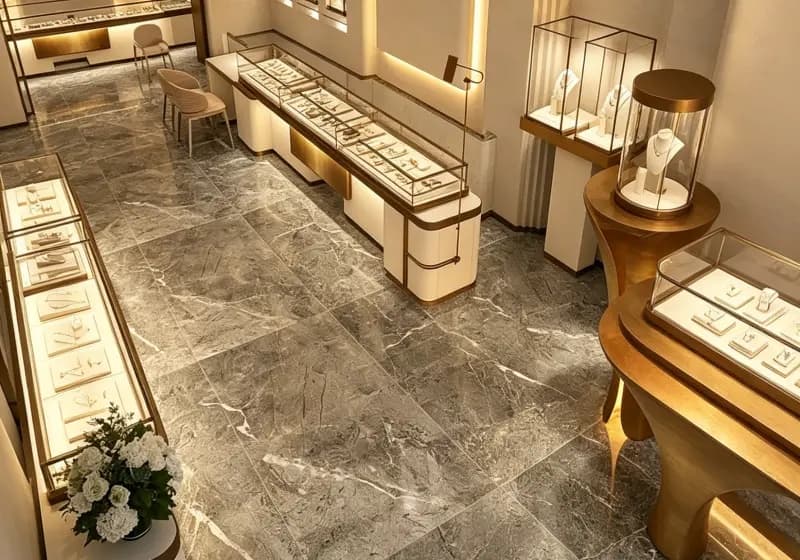 Material & Finish: Curated for durability and luxury, the space uses high-grade grey marble for flooring, matte beige wall finishes, and brushed gold metal for structural and decorative accents. All materials are selected for their scratch resistance, easy maintenance, and ability to complement the brilliance of fine jewelry.