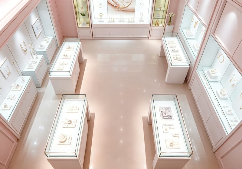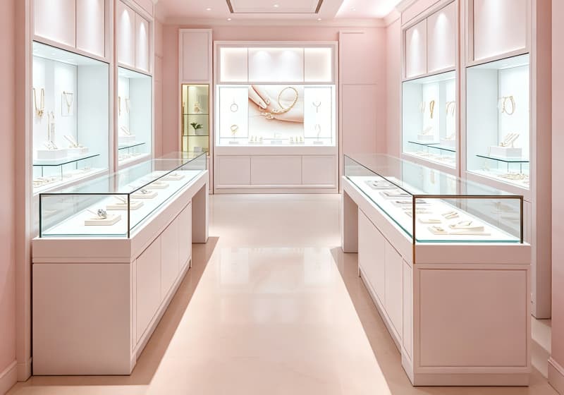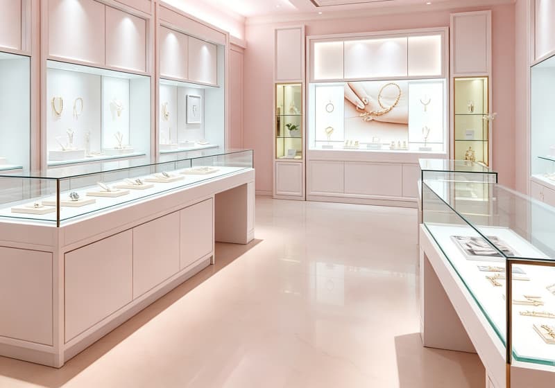 This stunning jewelry store features a soft, blush-pink color palette that exudes timeless elegance and luxury. The space is illuminated by recessed ceiling lights, casting a warm, inviting glow across the polished marble floors and custom display cases. Sleek glass-topped counters line the space, showcasing fine jewelry on minimalist white stands, while wall-mounted vitrines highlight statement pieces against neutral backdrops. A central feature wall with a large decorative panel and integrated lighting serves as a focal point, flanked by tall display cabinets. The clean, modern cabinetry, subtle gold accents, and thoughtful lighting design create a sophisticated, airy atmosphere, perfectly tailored to highlight the beauty of fine jewelry while offering customers a serene, luxurious shopping experience.