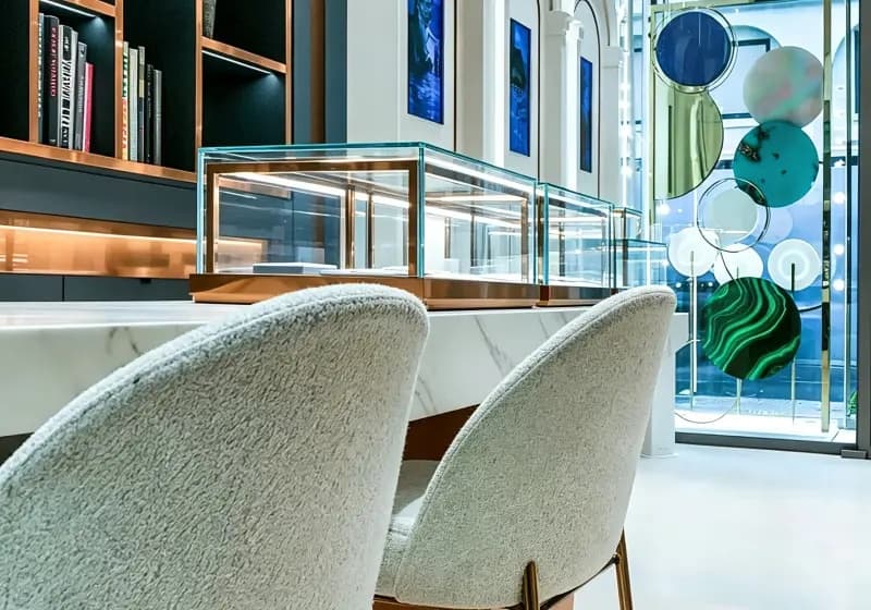 This is a sophisticated, modern luxury jewelry boutique that masterfully blends minimalist elegance with opulent, curated details. Sleek glass display cases with polished rose gold frames rest atop a pristine white marble counter, illuminated by integrated LED lighting to showcase fine jewelry pieces in their full brilliance, while a dark, gold-trimmed built-in bookshelf adds a refined, cultured backdrop. Plush, comfortable seating creates an intimate, private consultation space for clients, and natural light floods the area through a large glass facade, complemented by warm ambient lighting to craft a welcoming, luxurious atmosphere. Vibrant, artistic circular glass installations by the window infuse the space with contemporary artistry, resulting in a bright, airy yet intimate environment that perfectly reflects the timeless luxury of the jewelry it houses.
