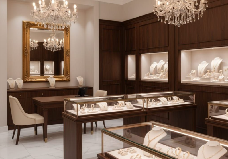 The design incorporates soft beige tones, gold accents, and textured finishes to create a welcoming and upscale retail atmosphere—perfect for luxury jewelry brands.