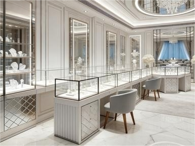 This complete luxury jewelry store display system features a central curved island counter with fluted white cabinetry and silver metal trim, paired with arched wall accents and a statement crystal chandelier. Designed for high-end jewelry boutiques, it creates a bright, airy, and sophisticated retail environment that elevates product visibility and brand prestige:• Establishes a clean, contemporary brand image with minimalist white cabinetry, sleek silver accents, and flowing curved architectural details.• The open, symmetrical layout combines central island counters, wall-mounted display units, and a mirrored focal wall, maximizing display space while fostering a luxurious, inviting shopping experience....
