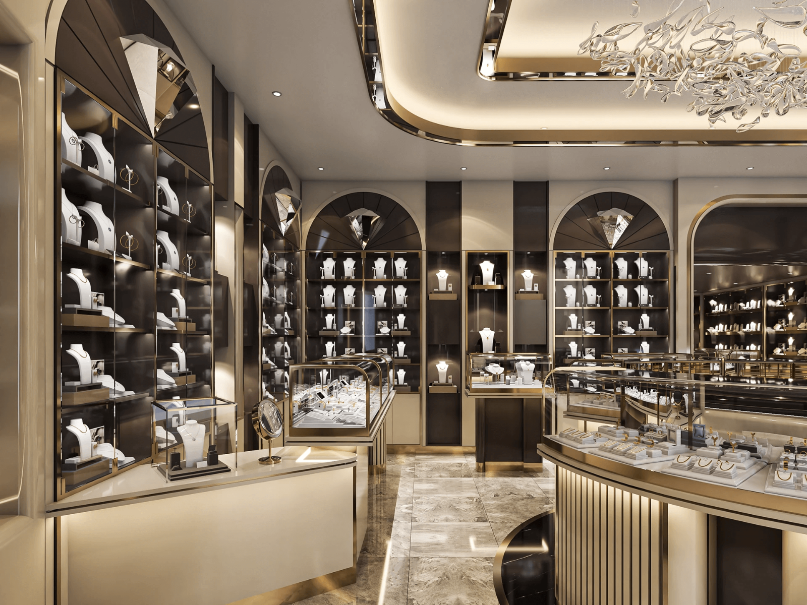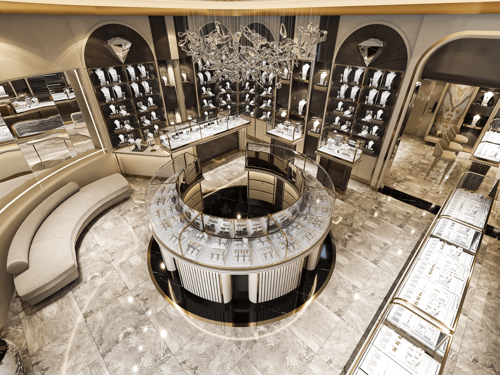 In the center, there is a central display counter. The counter is circular in shape, with an opening in the middle for staff access. To the left is a U-shaped sofa. Directly in front is an arched jewelry display wall cabinet. The brand logo is inlaid at the very top, strengthening the jewelry store's brand image.