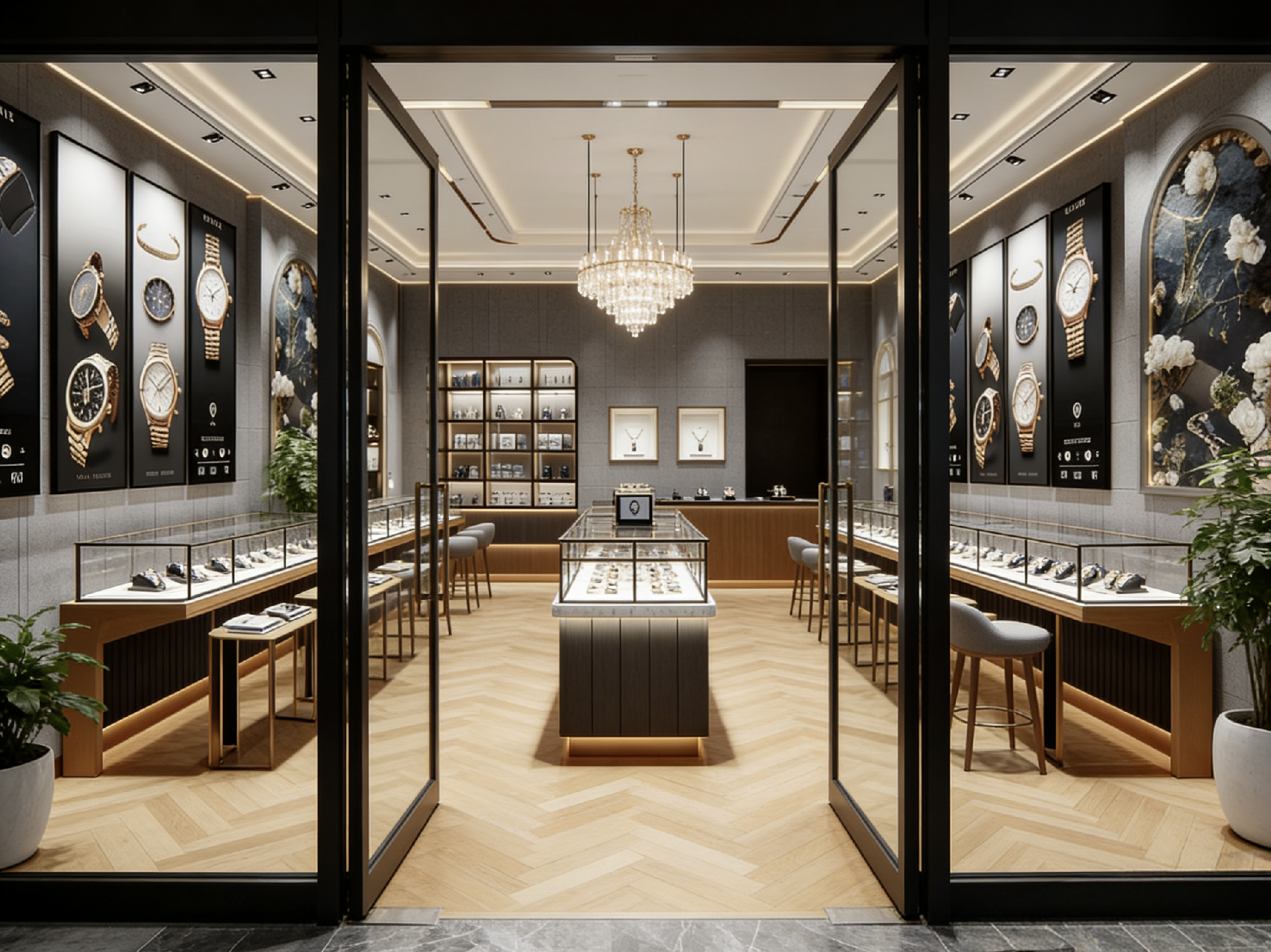 • The open, multi-level layout combines central island counters, wall display units, and customer seating, balancing unobstructed product visibility, client interaction space, and elegant retail aesthetics.