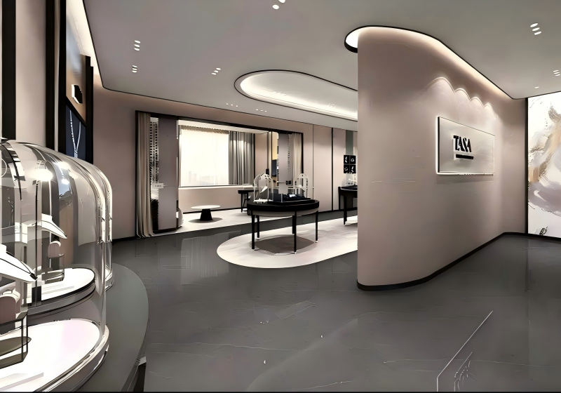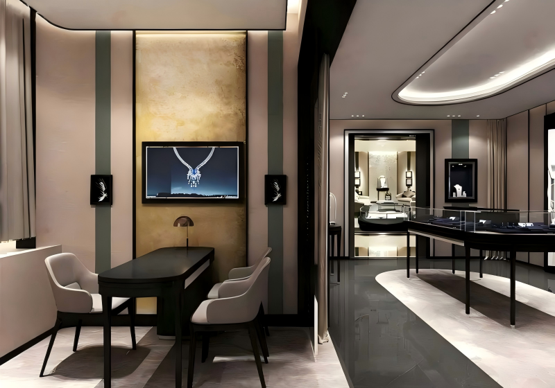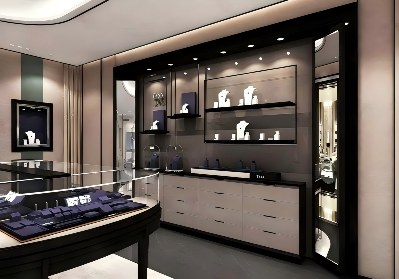 Layered lighting (recessed spotlights, cove lights, display case illumination) is strategically used to enhance jewelry’s luster while maintaining a warm, inviting ambiance. Circular ceiling light fixtures
