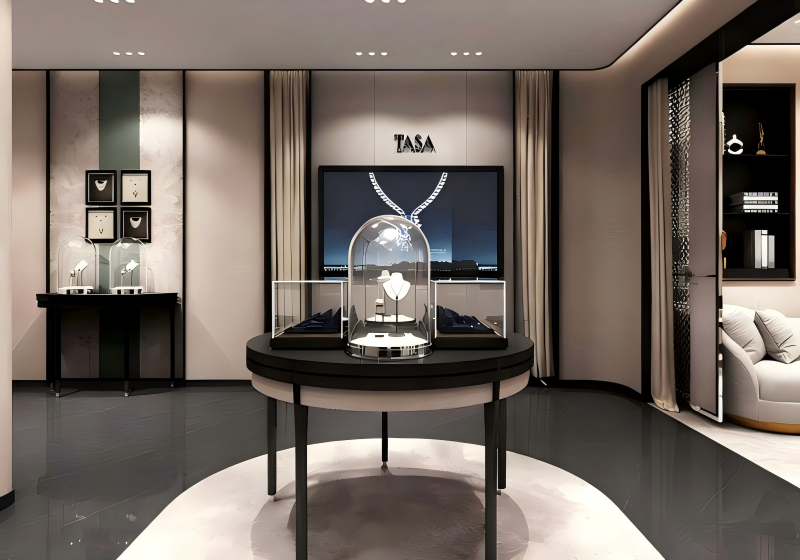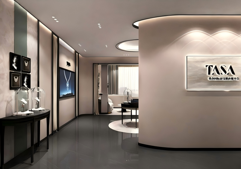 The "TASA" logo is subtly embedded in key areas (wall signs, display backdrops). Integrated screens showcase product details, while private seating areas balance openness (for casual browsing) and