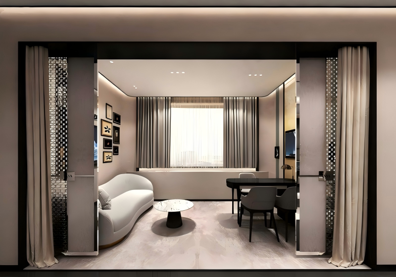 It uses a refined color palette of beige, black, and subtle green, paired with high-end materials (marble, textured fabrics, metallic trims) to create an elegant, upscale atmosphere. Curved architectural