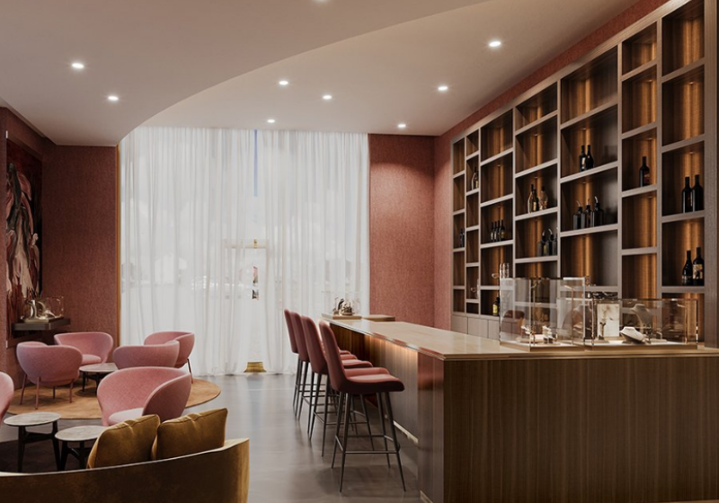 Storage: Closed cabinets and open shelving for inventory storage and decorative display (e.g., wine bottles/art pieces) to blend functionality with brand aesthetics.