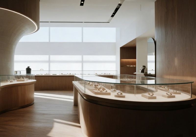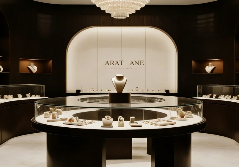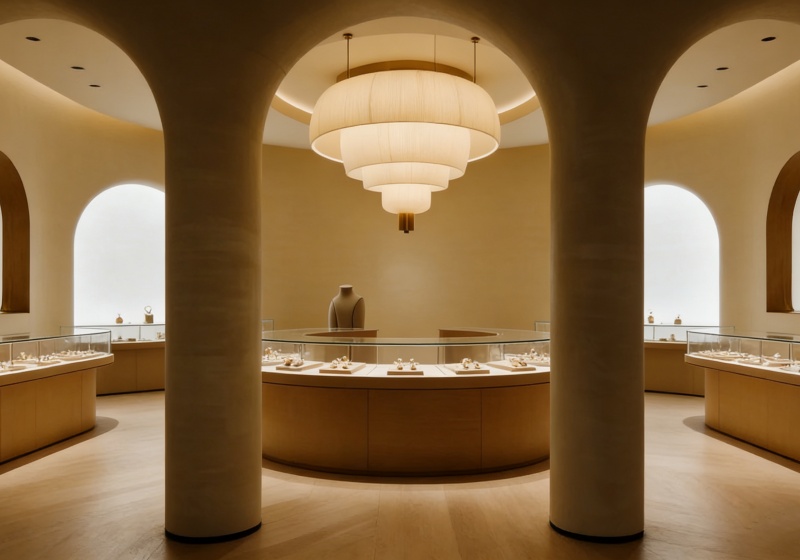 • Modular Layout: Freestanding circular island cases (core focal points) paired with curved wall-mounted cabinets enable flexible store configuration, adapting to diverse retail space sizes.