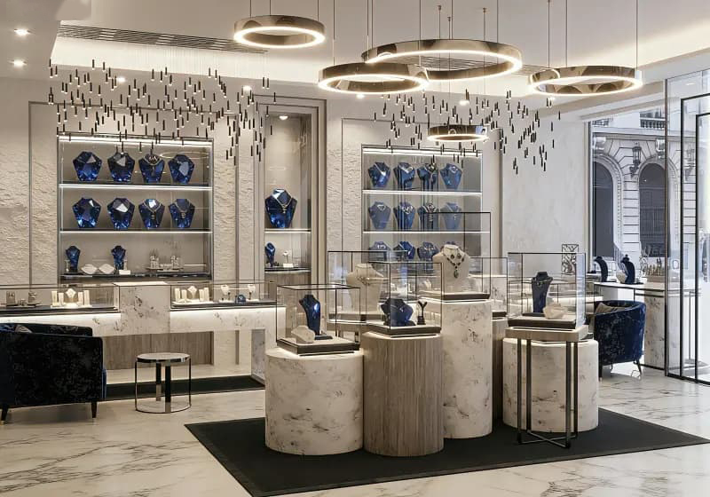 This elegant jewelry boutique blends luxury and sophistication with a refined neutral palette. Polished marble surfaces and cylindrical display pedestals create a sleek, modern foundation, while deep blue velvet mannequins and seating add a rich, opulent contrast. Suspended circular LED chandeliers and cascading metallic pendant lights bathe the space in warm, focused light, highlighting exquisite necklaces and rings within glass cases. Symmetrical wall-mounted shelving and mirrored accents enhance the sense of spaciousness, while large glass windows connect the interior to the classic European streetscape outside. Every detail is crafted to showcase fine jewelry and deliver an immersive, exclusive shopping experience.