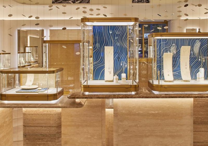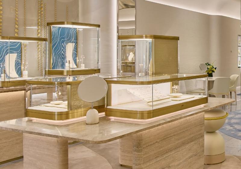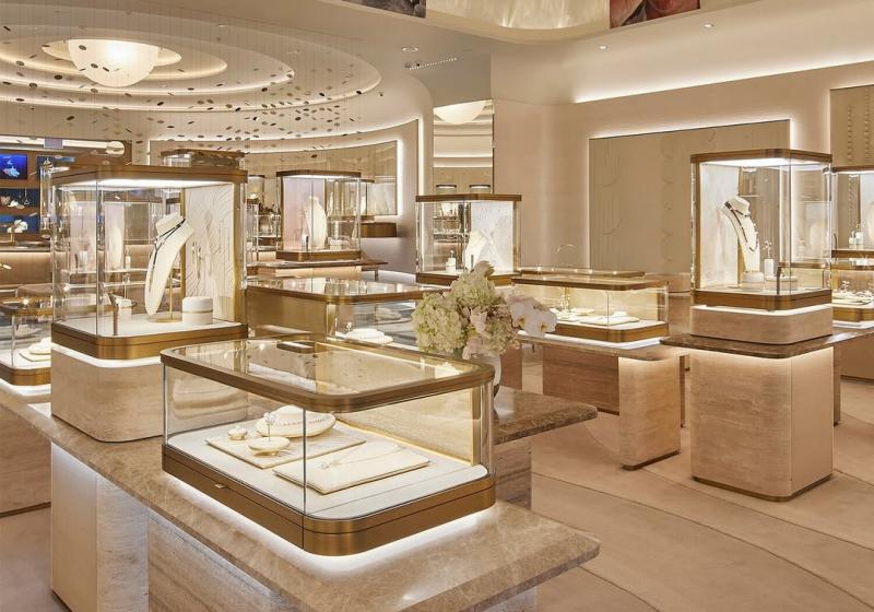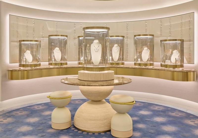 This design is ideal for high-end jewelry brands seeking a calm, sophisticated, museum-like retail presence.