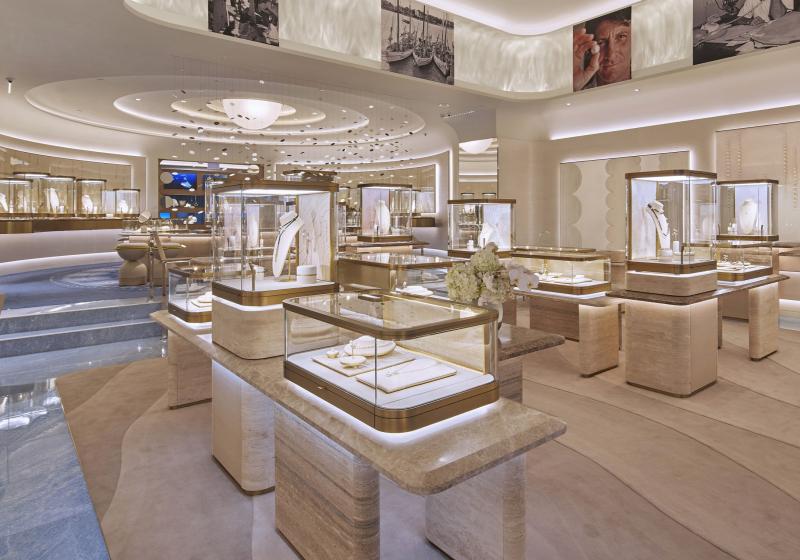 The flowing ceiling design and rounded showcases guide customers naturally through the space, encouraging longer stays and deeper engagement with each piece.