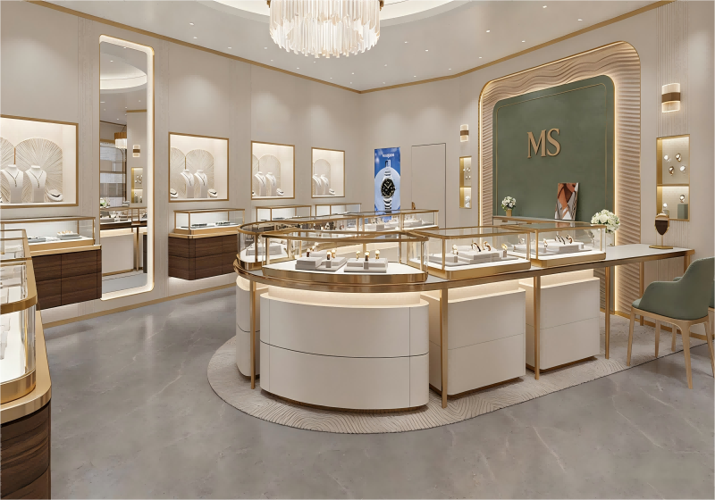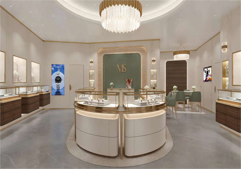 1. Display System: Transparency + Layering to Maximize Jewelry Value - Curved glass display cabinets with built-in lighting ensure 360° display of jewelry.