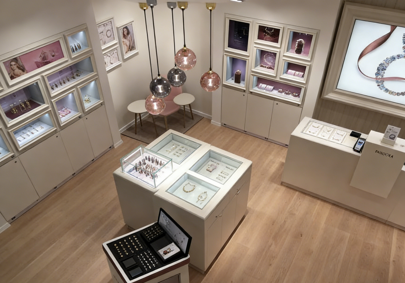At Myshine, we design and manufacture custom jewelry display cabinets that enhance brand identity, improve product presentation, and elevate the overall shopping experience.This project showcases a modern boutique jewelry store display solution, created for brands that value elegance, softness, and refined luxury.