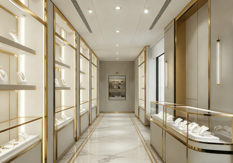At MyShine, we understand that a luxury jewelry store is more than a place to shop—it is a stage where precious gems and masterful craftsmanship take center stage. Our opulent modern luxury jewelry display cases, inspired by the breathtaking aesthetic of your reference boutique, are designed to create an immersive retail environment that blends classic opulence with a sleek, modern sensibility. Whether you are opening a new flagship location or reimagining your existing store, these custom display solutions are engineered to showcase your collections in their most radiant light, while ensuring uncompromising security, durability, and seamless integration with your brand’s luxurious identity.