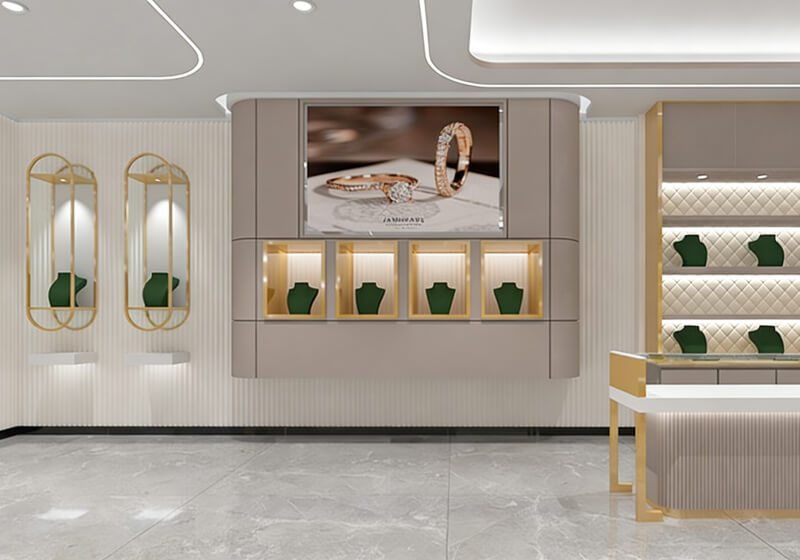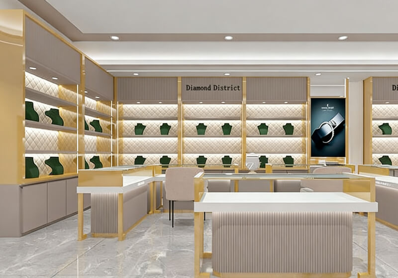 This is an interior design plan for a jewelry store, featuring a modern and luxurious style. The space primarily uses off-white and gold as its main colors, complemented by marble flooring, creating a high-end and elegant atmosphere.
