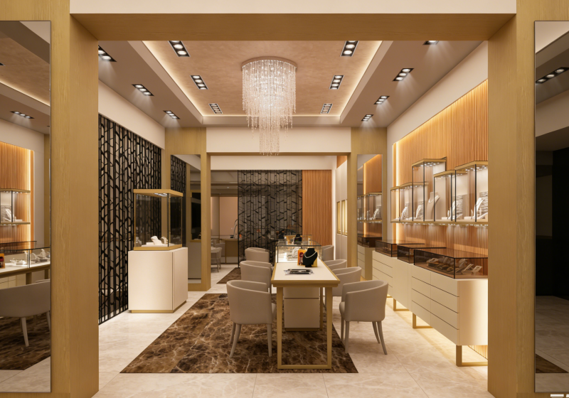 Soft Ambient Lighting: Integrated LED spotlights and strip lighting replicate the gentle, flattering glow of chandelier-lit boutiques, making diamonds, gemstones, and gold pieces sparkle without harsh shadows.