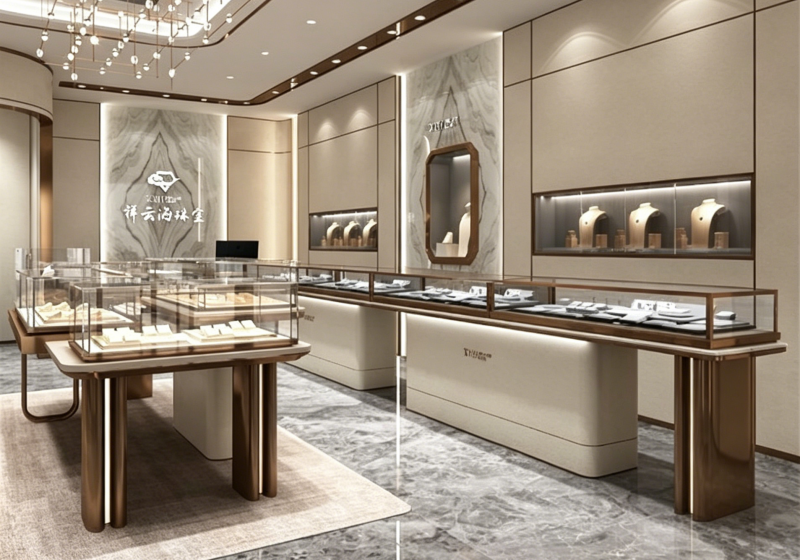 Integrated LED Strip Lighting: Soft, warm backlighting in wall-mounted showcases and under-counter lighting for freestanding cases, casting even illumination across necklaces, rings, and bracelets.