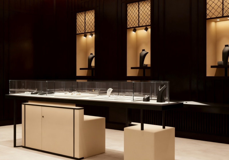 Combining circular showcases, lattice window details and embedded warm lighting to create an intimate, prestigious space for high-end heritage jewelry: