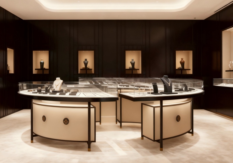 The layout features a central circular showcase + wall-mounted niche displays + private browsing zones, balancing jewelry visibility and exclusive appreciation.