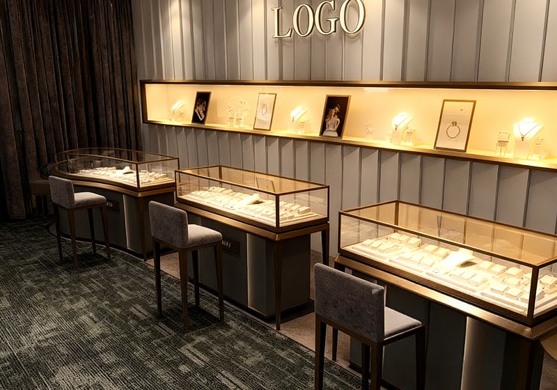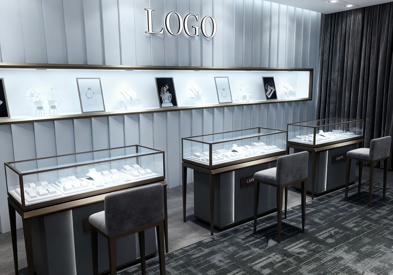 Use transparent glass display cases with metallic brown frames to highlight jewelry’s delicate texture against the soft light gray backdrop.