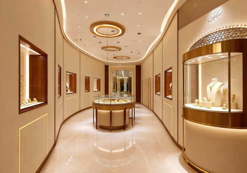 The layout features a central circular showcase + wall-mounted display niches + private browsing zones, balancing jewelry visibility and exclusive appreciation.