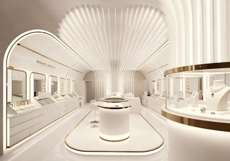 This jewelry store adopts a pure white & light gold futuristic minimalist luxury style, combining radial luminous ceilings, streamlined showcases and arched doorways to create a sleek, avant-garde space for futuristic avant-garde jewelry: