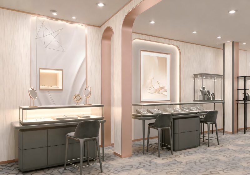 Use transparent glass showcases with warm light strips to highlight jewelry’s delicate design against the rose gold & gray elegant backdrop.