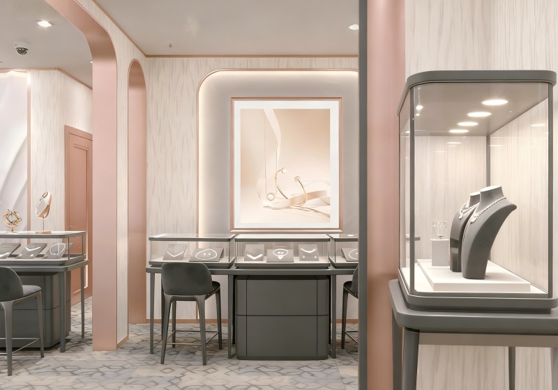 This jewelry store adopts a rose gold & gray modern elegant light luxury style.