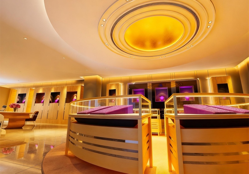 Build a regal brand image with warm gold domed ceilings, light wood curved counters and purple display linings.