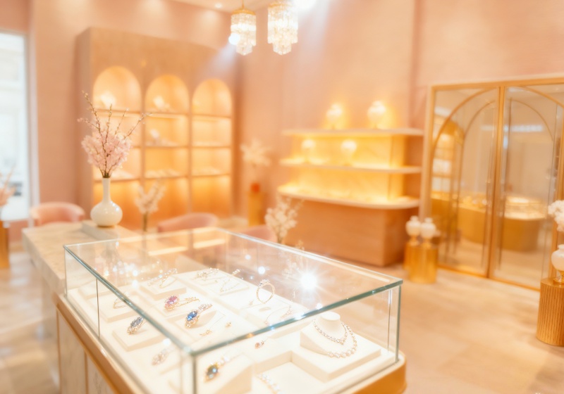 This jewelry store adopts a blush pink & light wood romantic light luxury style, combining arched luminous showcases, crystal chandeliers and pink soft furnishings to create a gentle, sweet space for women-oriented light jewelry: