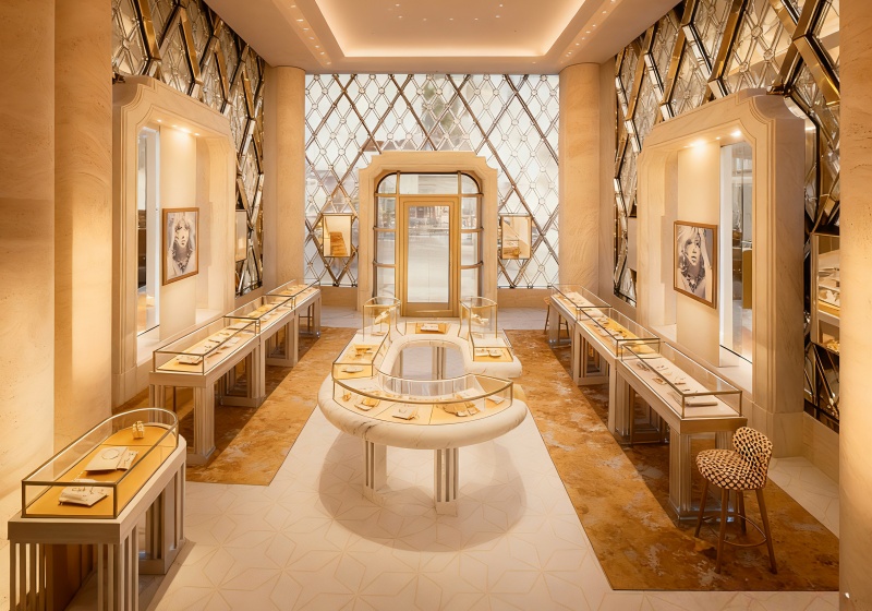 This top-tier jewelry store adopts a beige & gold French luxury style, combining diamond-patterned art glass, curved marble displays and symmetrical layouts to create a prestigious space for high-end couture jewelry: