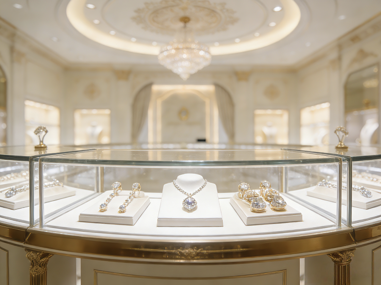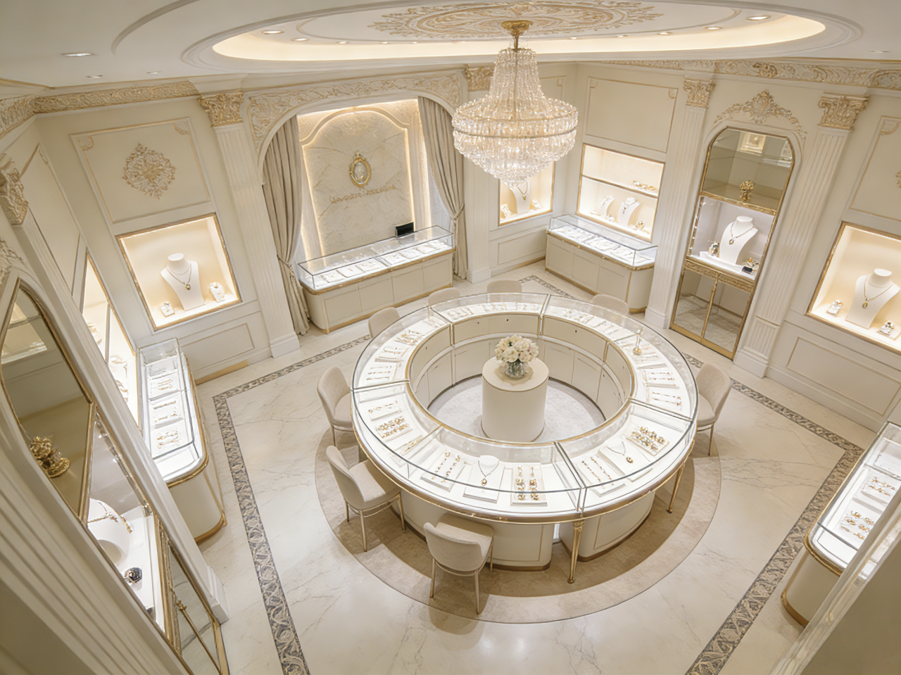 - Design a circular focal-point layout to enhance customer engagement and jewelry display visibility.