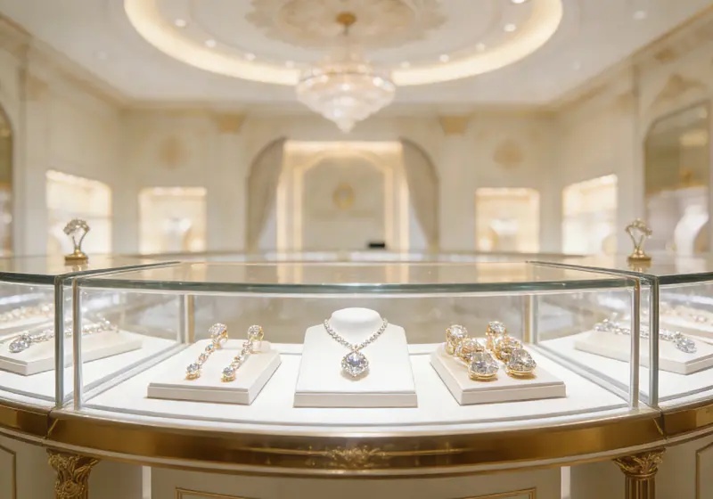 - Select high-end display fixtures that complement the cream-gold scheme and highlight jewelry brilliance.