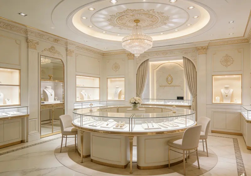If you aim to design a timeless luxury jewelry store with a cream and gold color palette, we provide professional guidance to craft an elegant and inviting space: