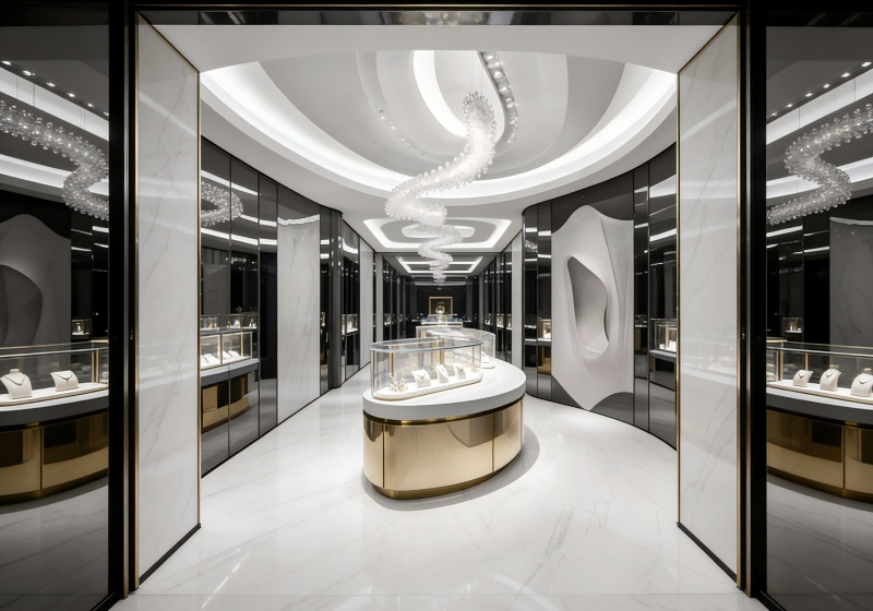 The layout features curved streamlined showcases + reflective wall displays + immersive lighting zones, balancing jewelry visibility and futuristic browsing experience.